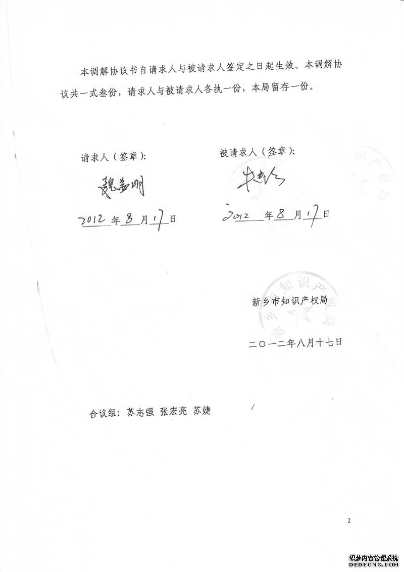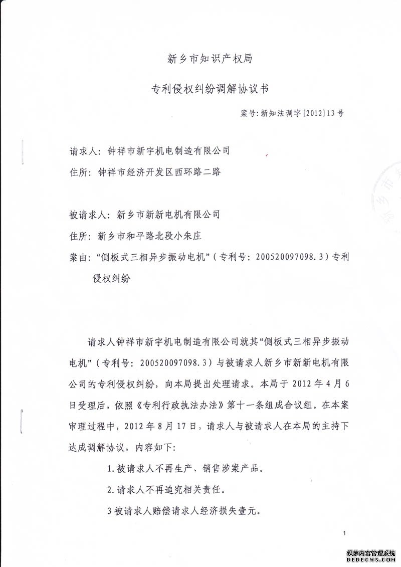 新鄉市知識產權局專利侵權糾紛調解協議書
